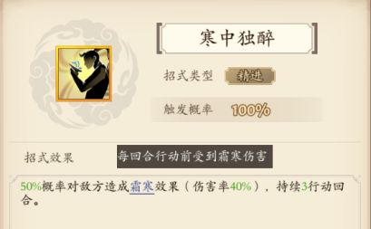 霜寒:每回合行动前受到霜寒伤害(根据伤害率造成伤害,不受加成招式伤害的属性和效果影响,受实战增伤加成以及攻击加成影响)
