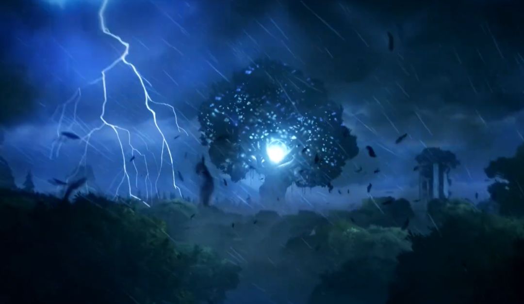 故事开始于一场暴风雨,背景中的精灵之树在暴风雨中不断抖动,配合背景中空灵的声音,游戏就在这么一个梦幻的场景中开始了。奥日是精灵之树的孩子,这暴风雨夺走了还未长大、只是精灵幼体的奥日,这也是这个故事的开端。
