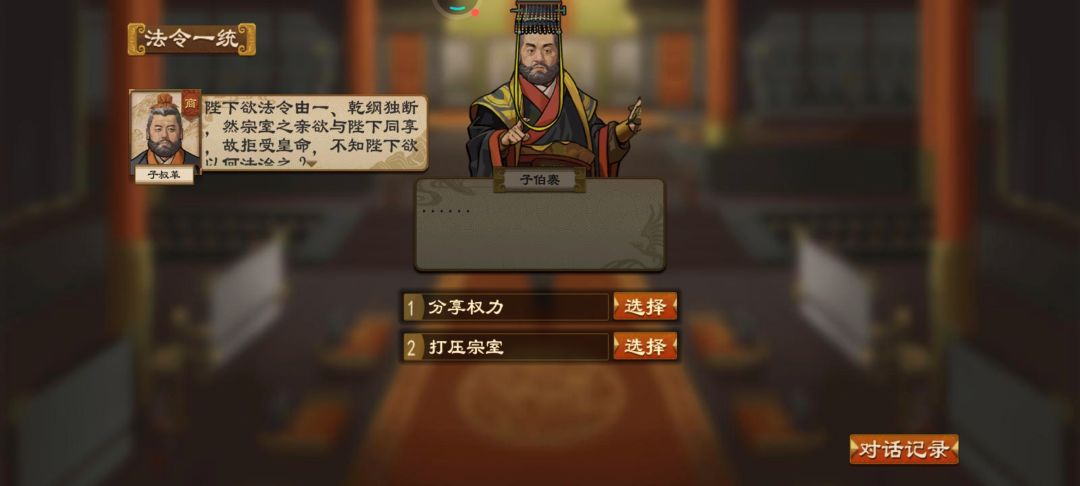 小总结:法令一统是必弹出的事件,其他三个都是概率事件。法令一统处,选择分享权利,要求储君智略为所有宗亲最高的,而选择打压宗室,要求君主智略为所有宗室里最高的,否则不通过;书简同文处,选查禁私学要求所有朝臣流派相同,否则不通过,但是似乎选用贤纳谏则必定通过;度量同衡处,选宗族自治要求所有城邑的叛心全部小于50,否则不通过,但是似乎选严明法度则必定通过;行止同伦处,无论选择亲近拉拢还是清缴余孽都必定通过。