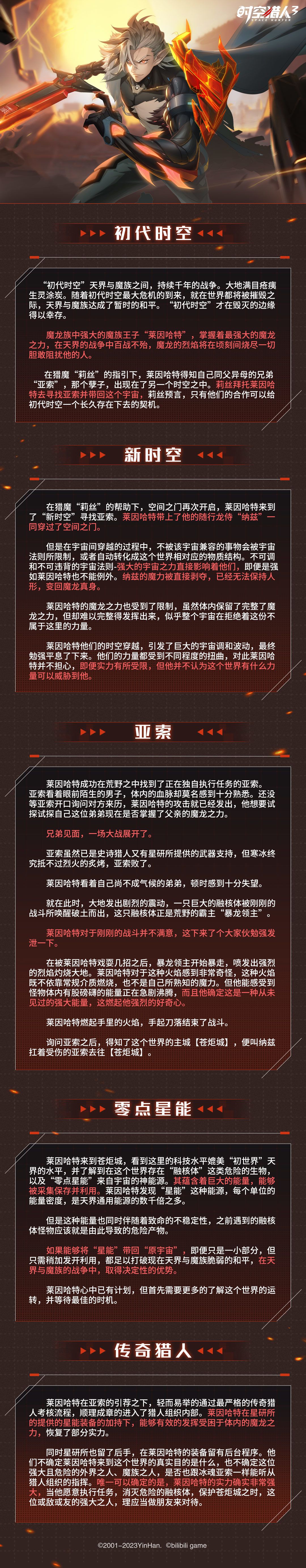 「龙渊·莱因哈特」是「冰魂·亚索」的哥哥。初代时空天魔大战后,时空崩坏不仅限于阿达拉一域,为了找到初代时空崩溃的真相和稳定初代时空,在猎魔指引下,莱因哈特来到了新时空。