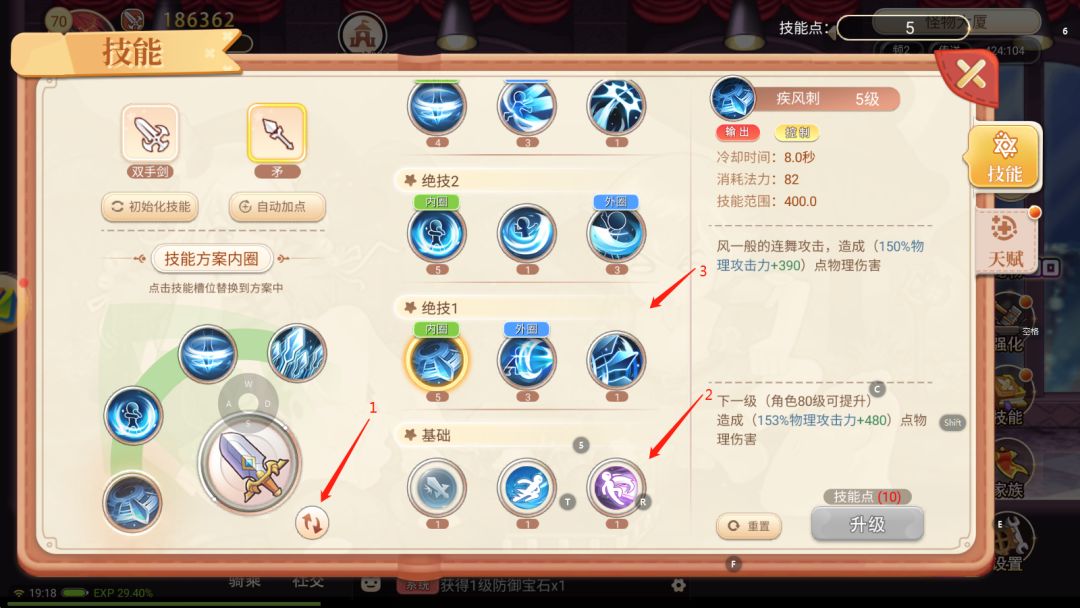 首先我们可以在技能按钮看到各职业的技能,在左侧可以看到我们的两行技能,点击这个循环按钮就可以看到下一排的技能了。在这里我就以战士角色作为例子讲解吧。