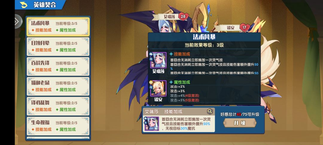 提升人物好感等级可以提升契合技能和属性,有些人物没有契合技能只有属性加成