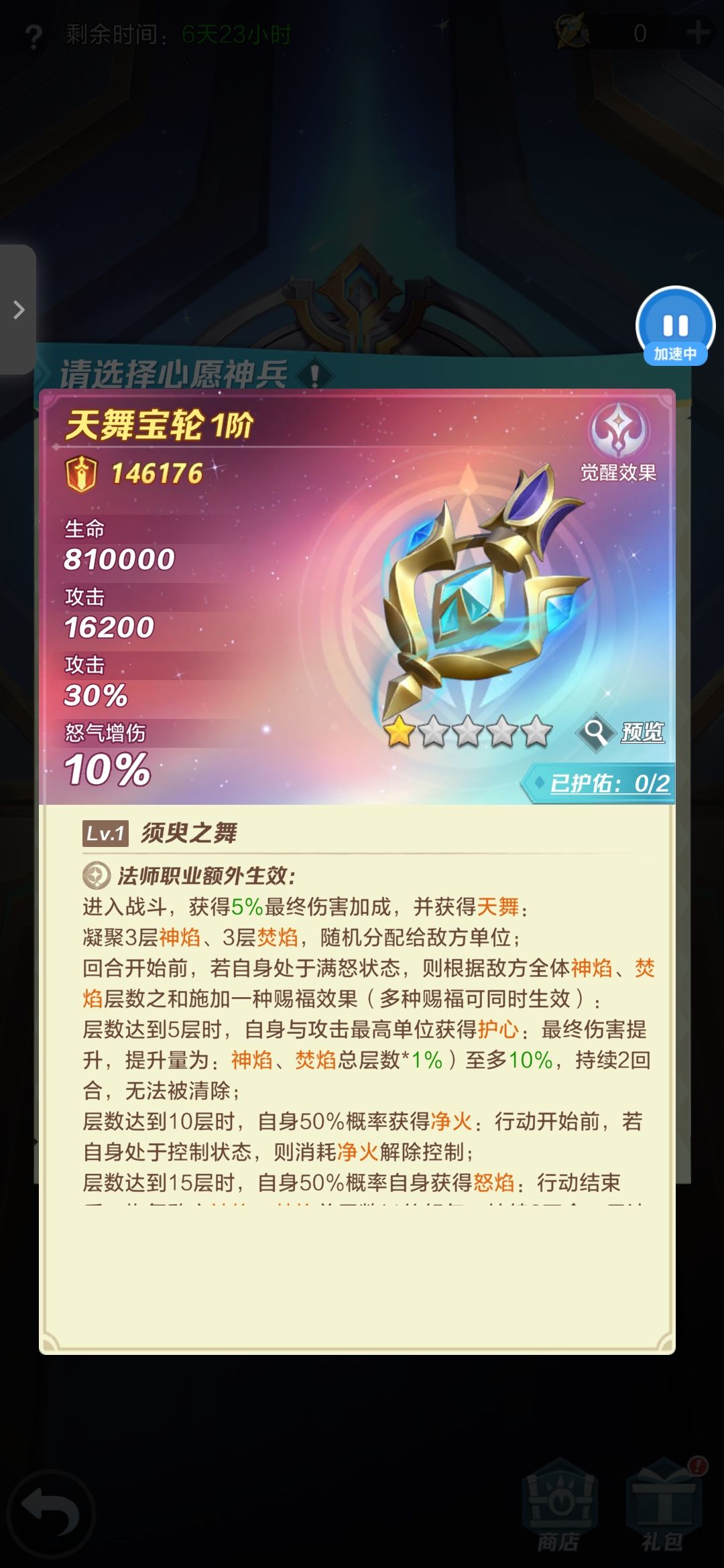 和满阶相比,除了概率还少了个20怒气增伤,无所谓,觉醒:开局无量,开局全体20%速,且意味着3回合便buff完全体循环了。
