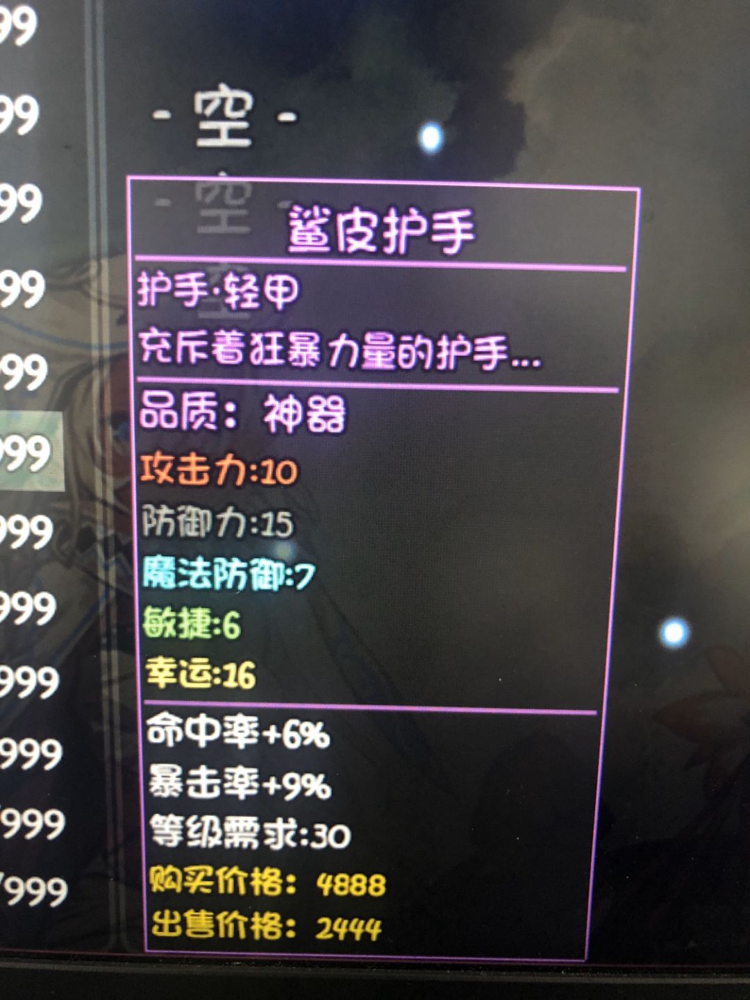 兄弟们刚到了中后期刷装备时先别照着副本和小怪刷个没完,带上十几支鱼竿去冰风谷钓鱼,一组(99个)鱼饵至少能钓上一个鲨鱼辣椒,比奇怪知识猫好打。打完必掉一个珍宝 肚中鱼和一个30级的神器。具体神器有以下几种,如图。