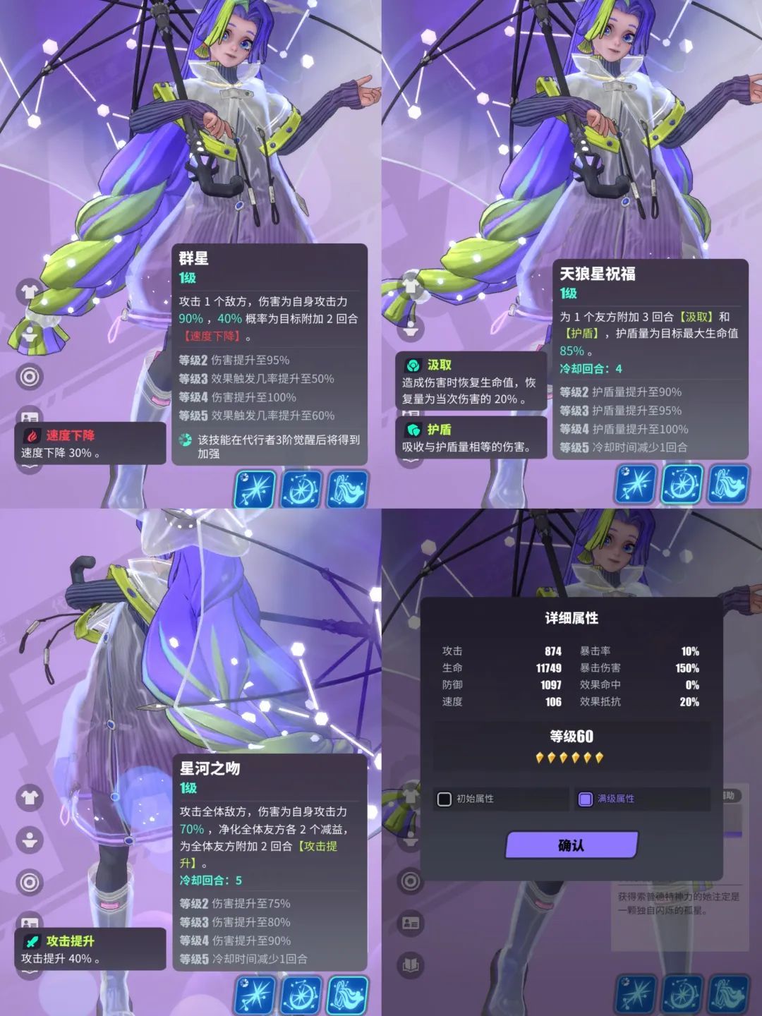 活动兑换满命四星闪耀,新手玩家无速度配速要求关卡皆可使用,其保护效果的盾在1,4共鸣和满技能的情况下,根据目标最大血量生成的盾为140%,全体净化和攻击提升赋予的BUFF荒芜也是可以就业型选手,但是其觉醒随机拉条和自带20点不稳定速度提升,很容易乱速,到时候会是一个超级折磨的体验,大家到时候谨慎配速,谨慎使用(需要严格配速环境下)但是新玩家可直接上岗使用,还是很好用的。
