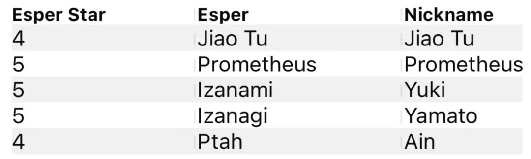 椒图四星,普罗米修斯五星,伊邪那岐五星,伊邪那美五星,普塔四星