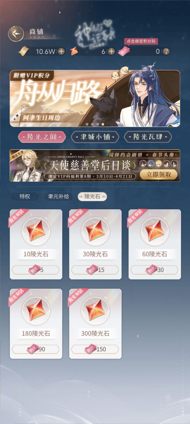陵光石的获取方式有如图两种,完成每日待办,每天最多获取五个,或者充值(购买周边即可获得积分)用积分来换