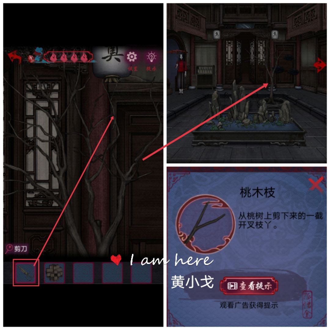 6.(院子)点击桃树,用【剪刀】剪得【桃木枝】