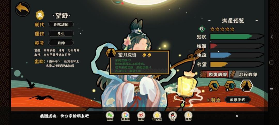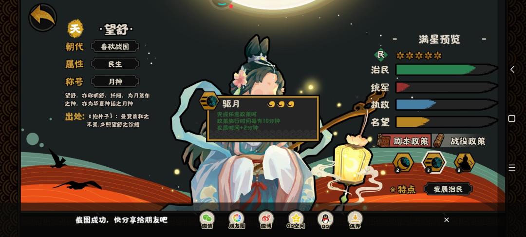 二技能驱月政策,永久政策,不是循环政策,但是跟制作的政治、军事、民生及名臣政策相关。简单来说就是制作其他政策时间就会增加相应的发展资源,举个例子这个政策1个半小时,90min的时间增加发展的时间也就是90/10*2=18min。一般来说一个半小时的政策时间已经算很长时间的政策,置换下来只会给18min的资源,若是低于10min的政策制作,只会得到0资源。相比之下,对比羲和这种给资源的名臣而言,羲和稳定给20min的资源且加5战斗力,虽然冷却时间有20min左右,但是相比较驱月,羲和的技能更加稳定化,真的等到望舒技能起飞只能说娱乐玩家可以尝试一下。这里认为驱月技能食之无味,弃之可惜。