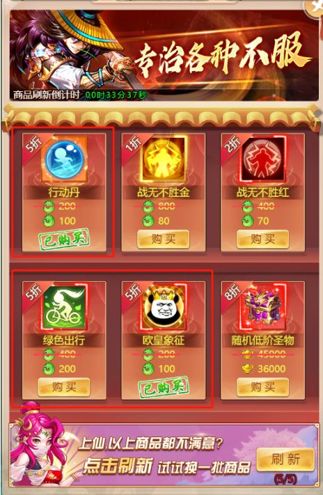 如上图,在神域商店里面,首先你要疯狂购买【行动丹】,其次是【绿色出行】跟【欧皇象征】。绿色出行能减少体力消耗欧皇象征能快速恢复体力每天有5次收到刷商店的机会,所以,一定要看着自己的体力值来购买,用元宝优先购买道具,不够再用仙玉购买。