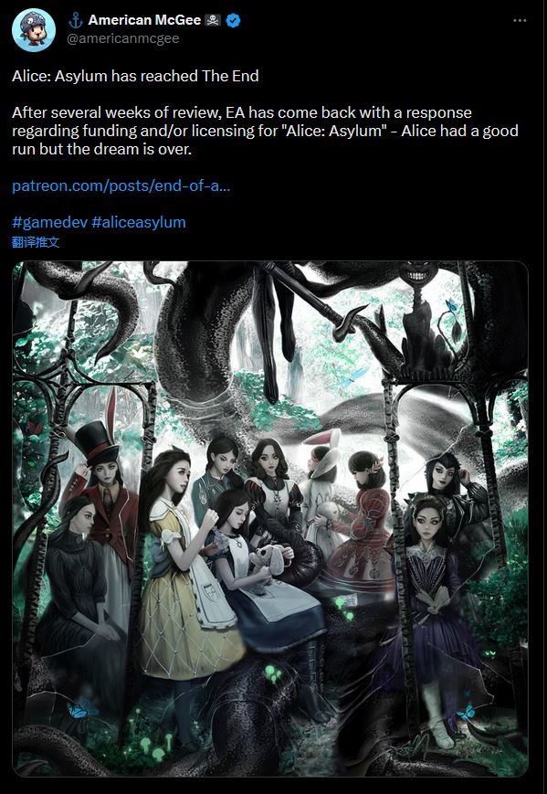 日前在推特上宣布,在长达十年试图推出《爱丽丝:疯人院(Alice Asylum)》——《爱丽丝:疯狂回归》系列作品的第三部续集——现在已经“梦终”。