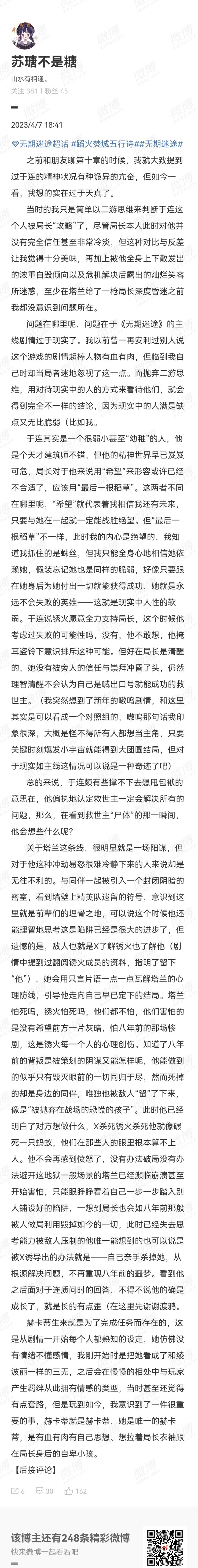 问题在哪里呢,问题在于《无期迷途》的主线剧情过于现实了。我以前曾一再安利过别人说这个游戏的剧情超棒人物有血有肉,但临到我自己时却当局者迷地忽视了这一点。而抛弃二游思维,用对待现实中的人的方式来看待他们,就会得到完全不一样的结论,因为现实中的人满是缺点又无比脆弱(比如我。