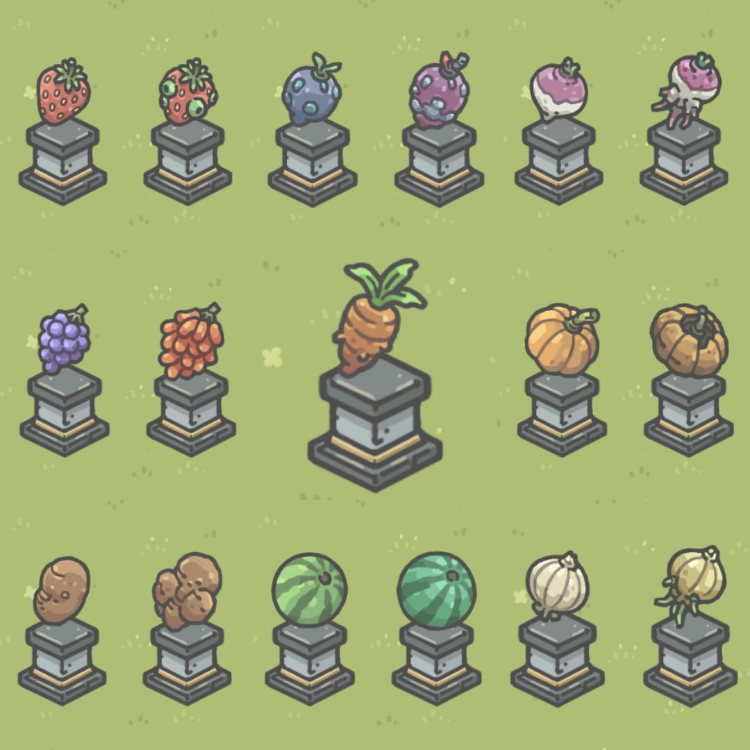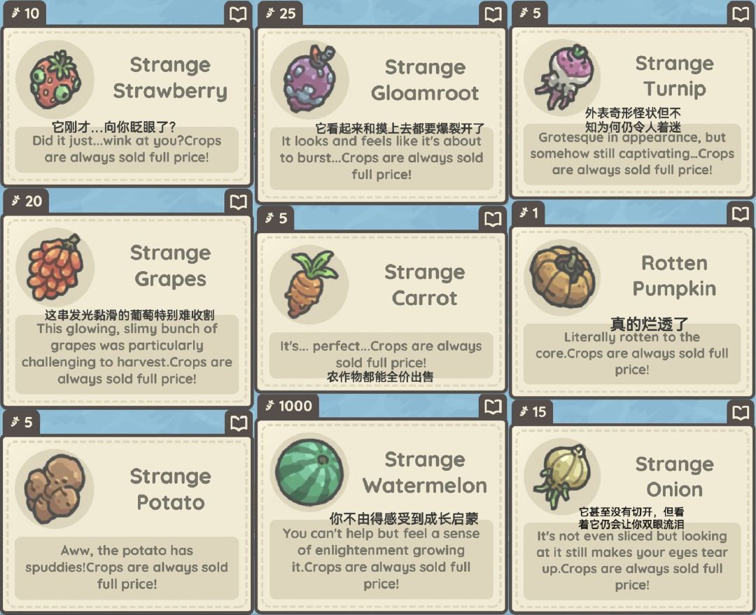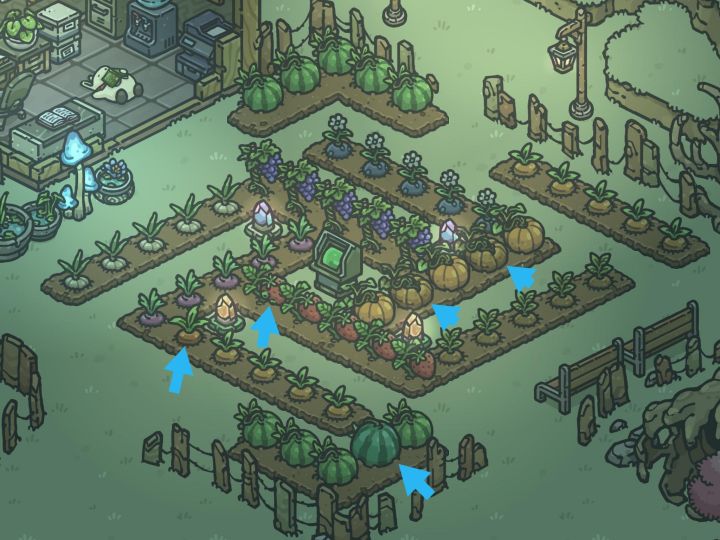 蓝箭头标识为异常果实,其它暂未获得。另:收获草莓有几率加速邻近作物生长,出现一次小星星加速半小时,可叠加,如果旁边是熟南瓜大概率会烂;gloam只能在19~7点间生长、收获,已成熟的早7点后也不能收获了。