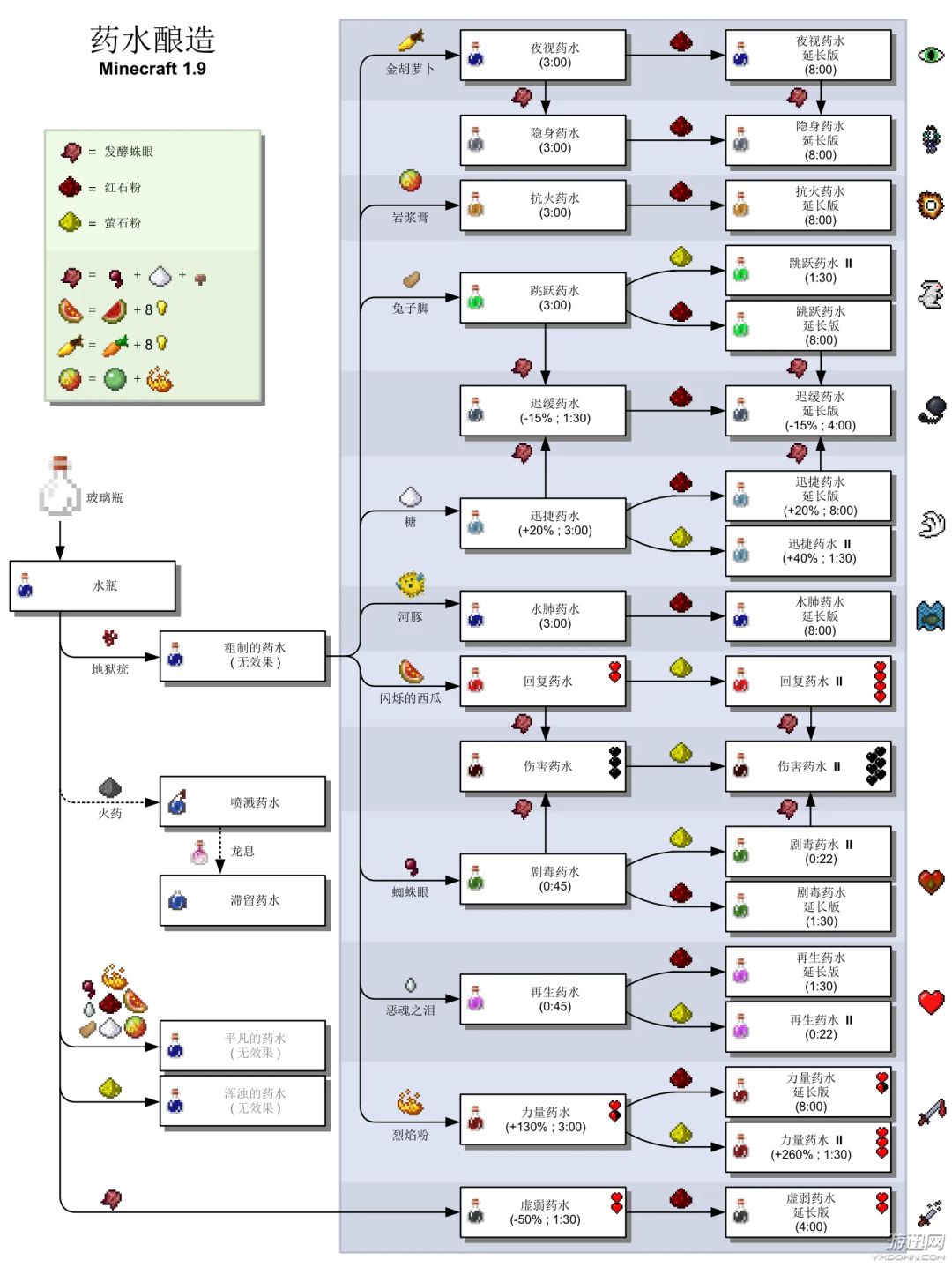 本帖部分可升级/改变药水效果的配方未打全,就是加萤石粉或发酵蛛眼(),不同虚弱药水配方的效果似乎参差不齐,本帖只提供炼法