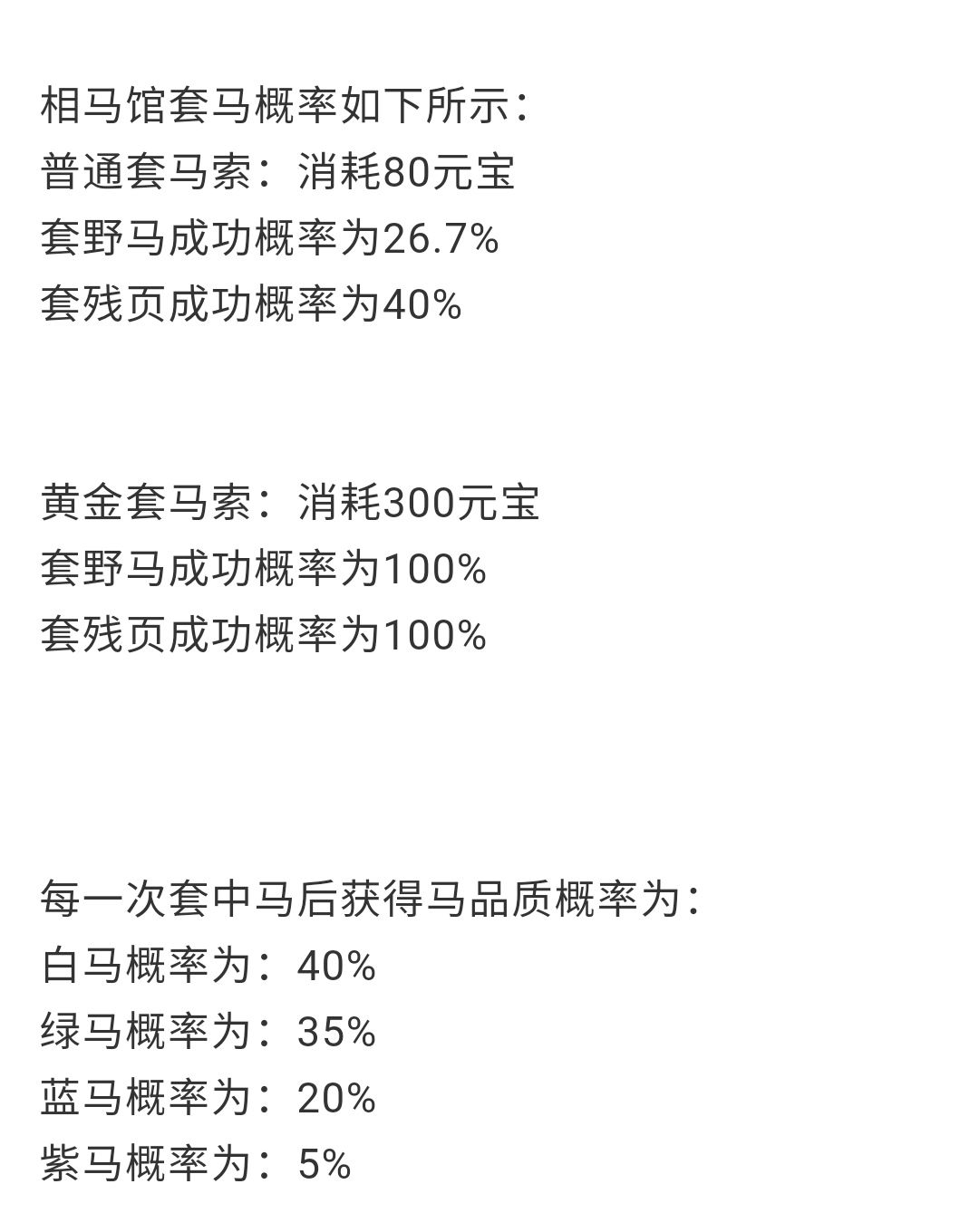 下面是一个套马小技巧,根据概率公示(如下图),普通套马索套名马的成功率为40%,套野马的成功率仅为26.7%,看到这里以前用普通套马索套野马的小伙伴陷入了沉思……