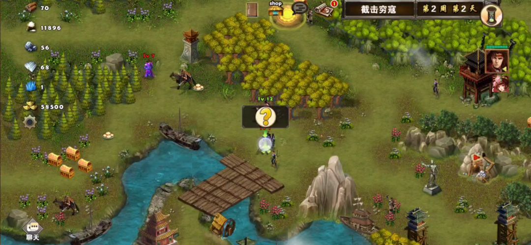 打法思路:到了第二周左边刺客再次刷新我们首要任务是先把刺客都清掉,然后在往下走回到起点把兵营里的兵都招募走,为后面的决战做准备。拿完兵还有时间就继续往右边走把地图上没拿的资源和属性都拿了,地图右边的传送阵可以直接传送到左上传送阵只要在第三周之前到那里就可以了。
