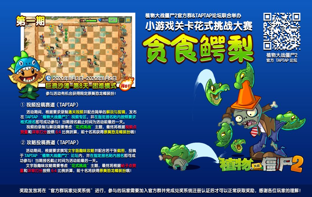 “植物大战僵尸2”推出了数款玩法各异的小游戏,在大家穿梭于各个世界的过程中,遭遇了很多趣味十足(?)的关卡。这些或经典或新颖的小游戏们,给大家带来了怎么样的回忆?转眼间,各位小伙伴们的暑假生活已经过去一大半啦!首先小维先祝大家暑假快乐!这么爽快的暑期生活,怎么能没有“植物大战僵尸2”相伴,由植物大战僵尸2官方群和 TAPTAP 论坛联合举办的第一届“小游戏关卡花式挑战赛”来啦,活动期间参与两条赛道中的任何一条,都有机会获得超超超超超稀有的限定级别装扮——原始向日葵恐龙帽,此装扮仅通过官方群举办的各类活动可以获得哦~