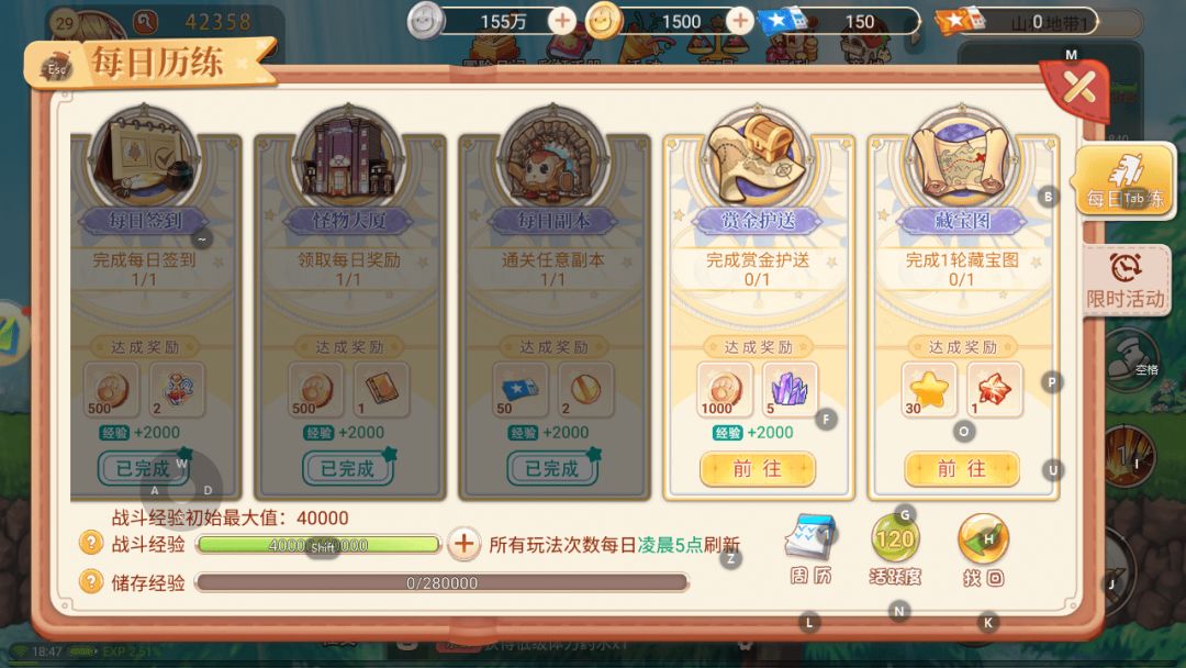 而另一个大的经验获取来源就是“玩法”了,会在每天凌晨5点刷新。建议玩法到第二天再去做,这样可以直接升到35级。