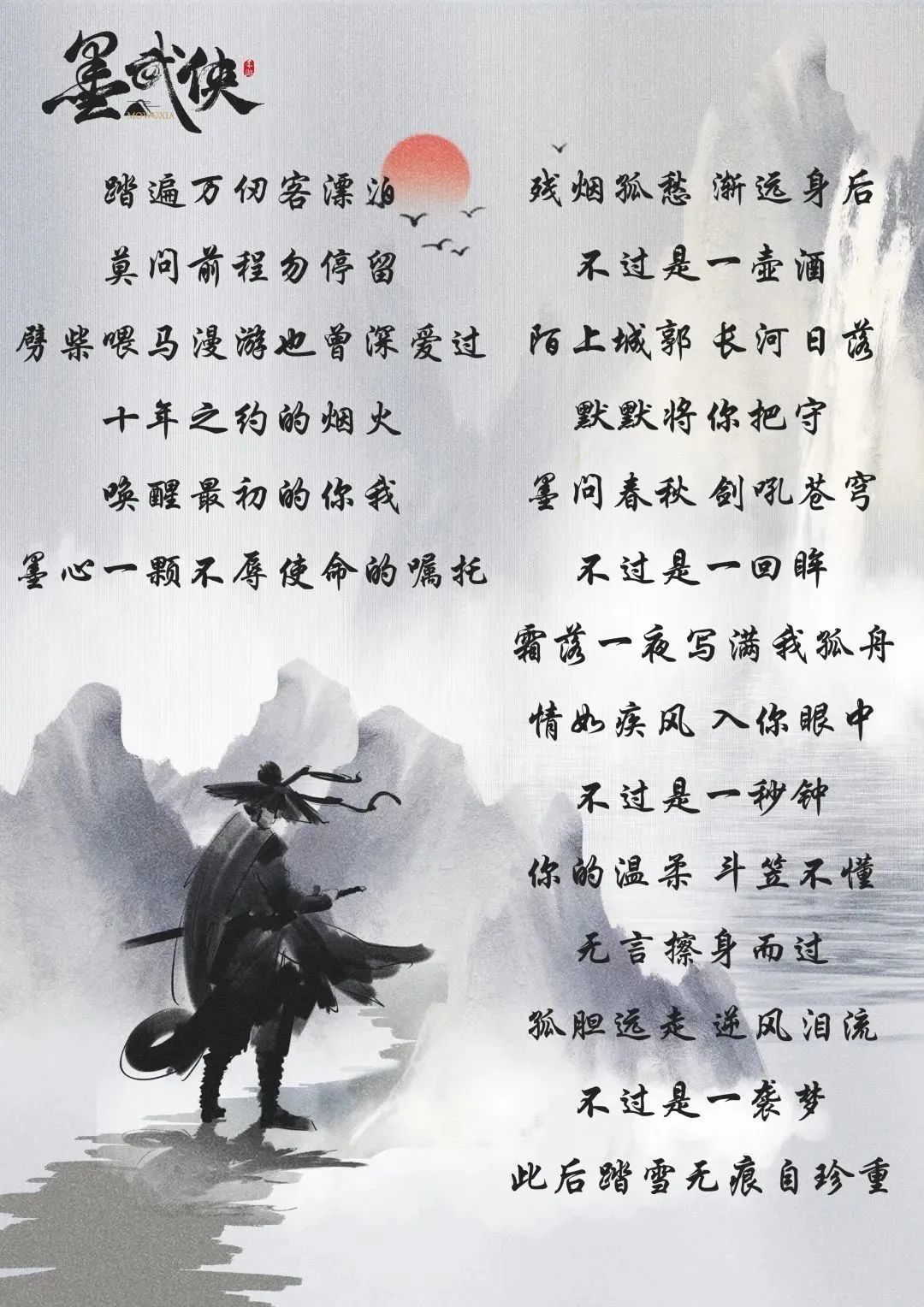 3.本次活动所需要的素材欢迎各位少侠加入墨武侠官方QQ群③群号:549602714,在群内文件进行自行下载取用,但取用过程中标注转载自墨武侠官方,《墨心》原唱:后弦,希望大家对于版权进行保护。