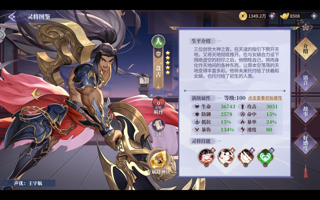 盘古的定位是人族防御类红卡,满级初始生命36743,处于全卡中(T1水准),T0是当之无愧的伏羲(40000+血量)。满级初始攻击3051,是目前防御类卡牌中的T0,远超伏羲与白虎一大截,这也就意味着盘古实际上也拥有着不俗的输出能力,当然相比攻击类卡牌肯定是没有可比性的。满级初始防御2578,单从面板而言相当脆弱,甚至不如同为人族的防御性橙卡周幽王。速度80,基本算是半截身子入土。这些数据表明,盘古最大的优势在于血量与攻击,但是防御和速度相当拉跨。这也注定了盘古必须要走防守反击的道路,而且需要队友开局给到比较好的保护。