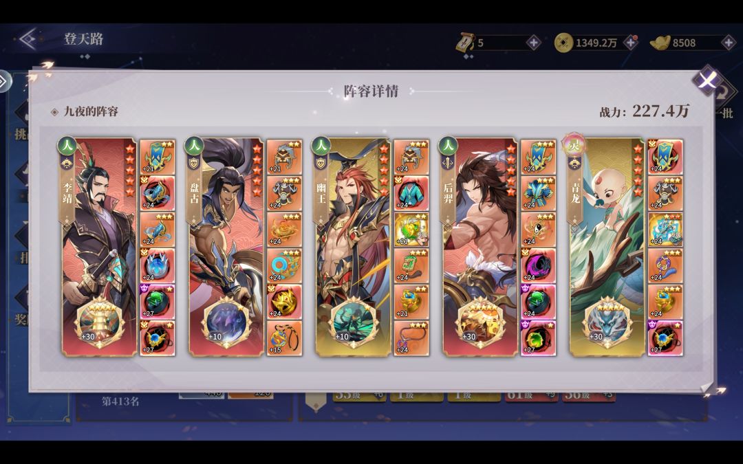 在阵容搭配上,目前比较主流且容易的思路是后羿(主C)+李靖(副控)+幽王(副T)+青龙(主控)+盘古。这一搭配最大的好处有两点,第一点是充分发挥了人族的优势,能够更好的契合不同灵将各自的属性,第二点是搭配并不过于烧钱,队伍整体为3红2橙,在培养上压力并不算很大。(下图来自九夜)