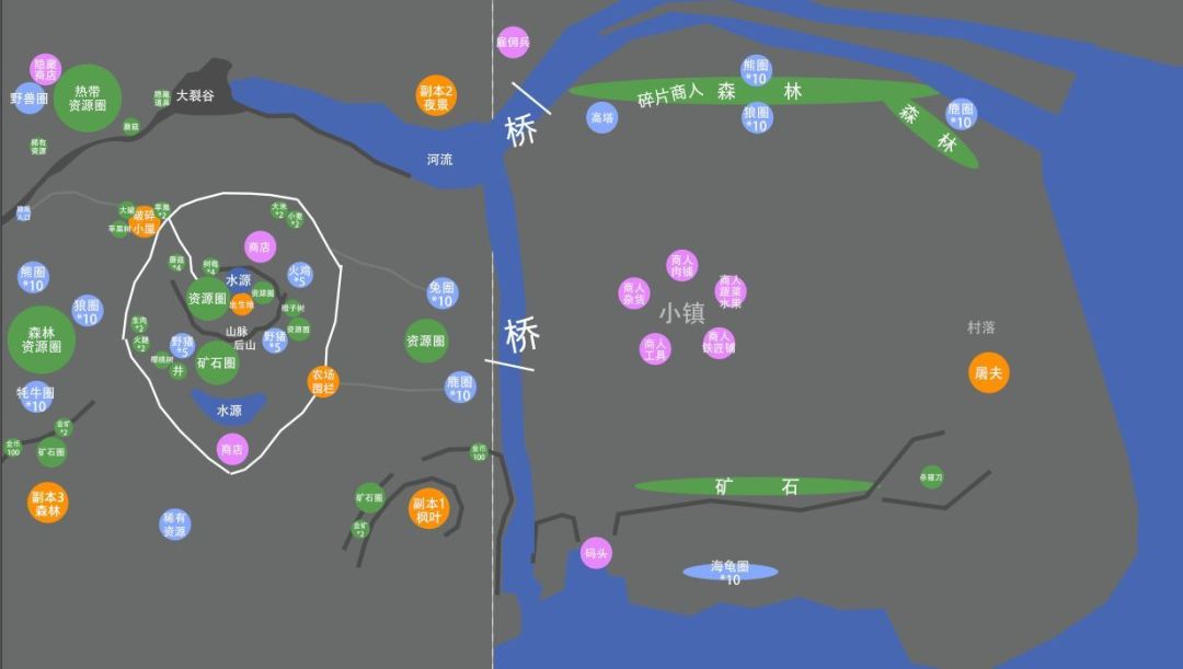 森林里有大量树木,三种动物熊,狼,牛,山上有一个金矿。
