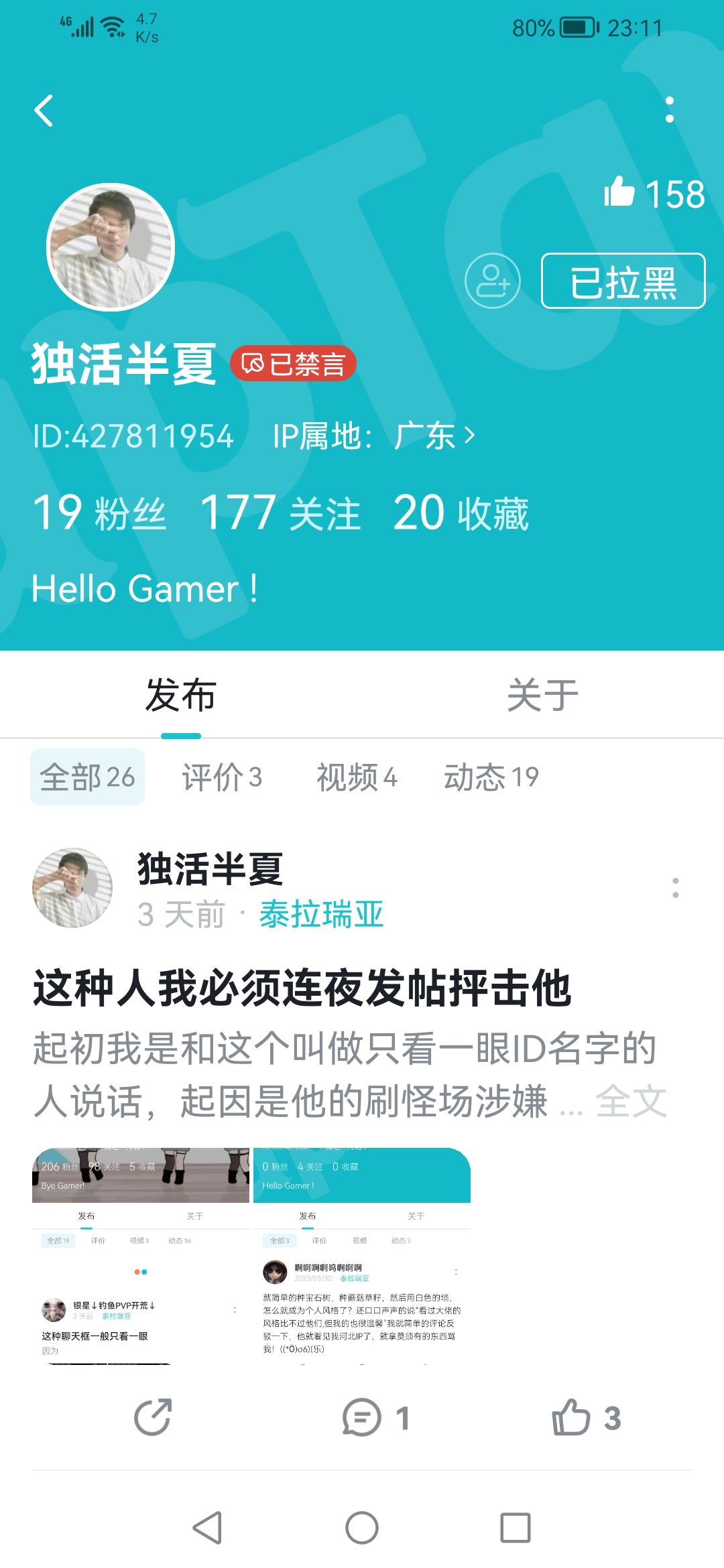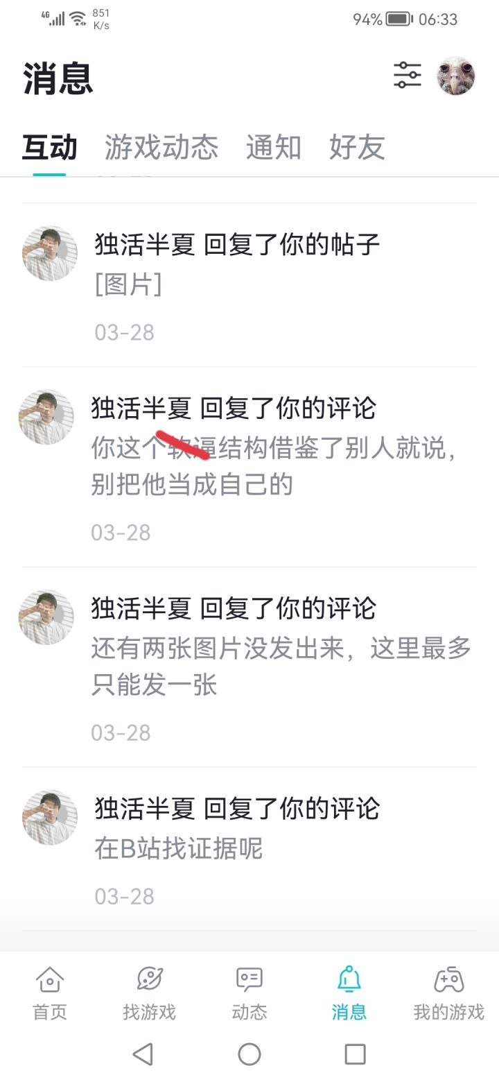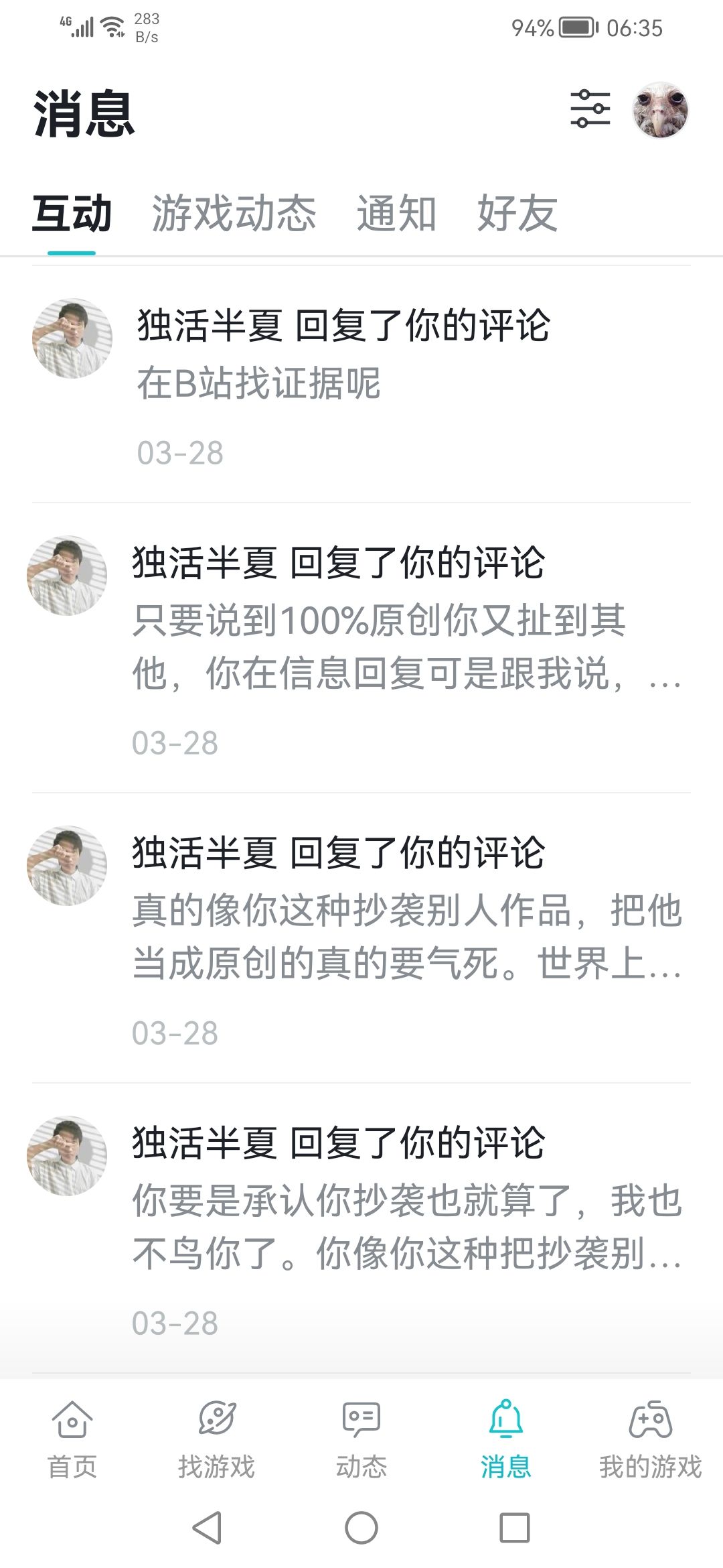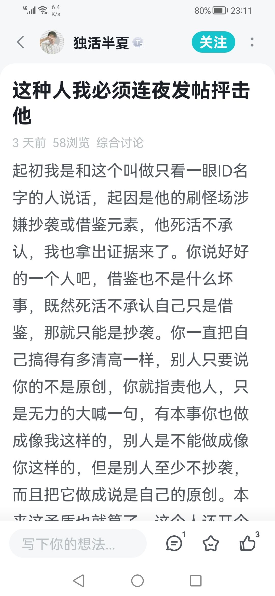 事件原委:本人于2023年3月24日发布了一篇标题为《开荒地图图片分享》的文件,介绍了我半年来的养老地图建造进度。文章发布当天『独活半夏』对我的刷怪场的原创性持怀疑态度,本人已及时回复并在之后作出了数次详细补充。后有一位玩家说“『独活半夏』就是酸了”,之后事情一发不可收拾,『独活半夏』数次无端指责并发表霸总言论侮辱性言论,不得已本人将其拉黑。近日,又有一位河北老乡在『独活半夏』评论区发表评论,致使『独活半夏』误认为那是本人小号,『独活半夏』后又发布侮辱性不实言论。