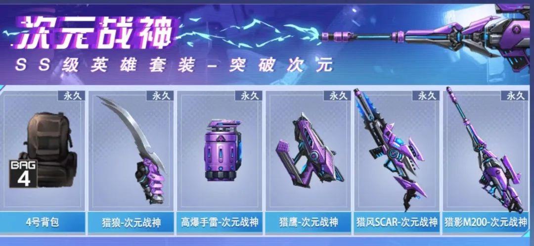 本文首发【全民营地】公众号,未经授权禁止“抄袭文章”转载至其它平台。又到了周末的尾声,明天又是新的一周,小伙伴们又要开始忙碌起来,在忙碌的工作中也别忘了,给自己大脑休息放松一下,比如坐下来看看窗外的绿叶喝杯咖啡提神,比如坐着安静的玩着全民枪神:边境王者。本期小编带小伙伴了解下SS级英雄套装-突破次元活动。感兴趣的小伙伴一起看一下吧!先了解一下活动详情:突破次元战神这次活动包含了:一个4号背包,一个近战武器,一个高爆手雷,一把副武器以及两款枪械武器。活动内的物品都是统一的价格,650点劵购买一次,但是获取方式是会按照以从左至右的顺序购买的。获得奖品会从奖池中扣除,不会重复获得,并且都是永久获得的,第一次的4号背包卡是可以解锁一个新的背包栏,可以在对局中多选择一个套装的武器。然后依次是近战武器猎狼、高爆手雷、副武器猎鹰、主武器猎风SCAR和猎影M200。