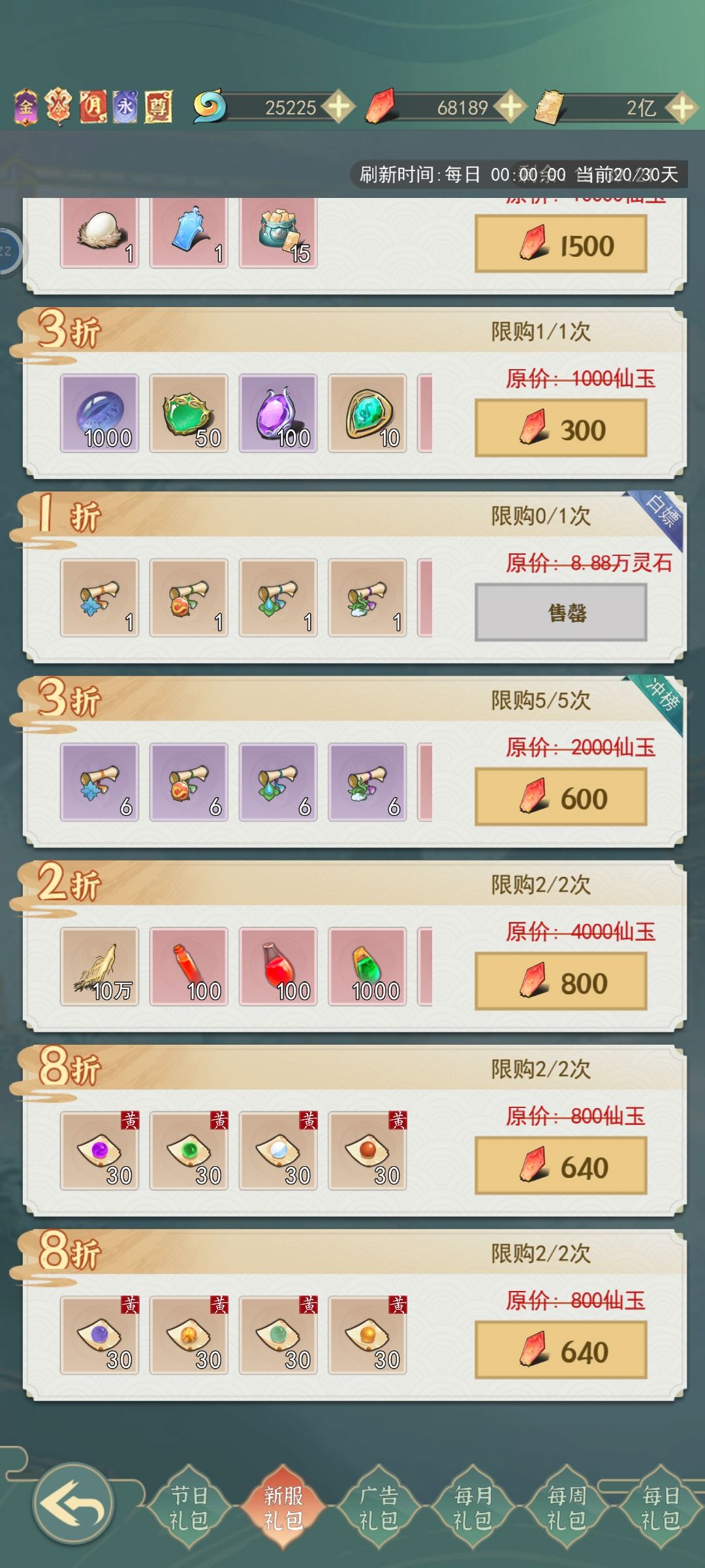 新区有维持一个月的新服礼包,新区一般在周二周六开。新服礼包里的售价600仙玉的钥匙礼包推荐购买。在其他因素不变的情况下,钥匙的多少影响你飞升灵界的速度,早飞升早享受。