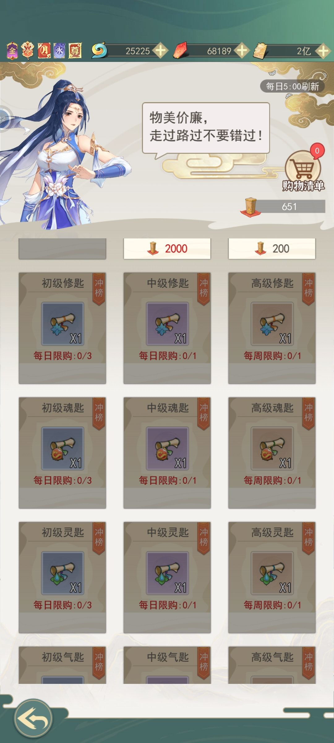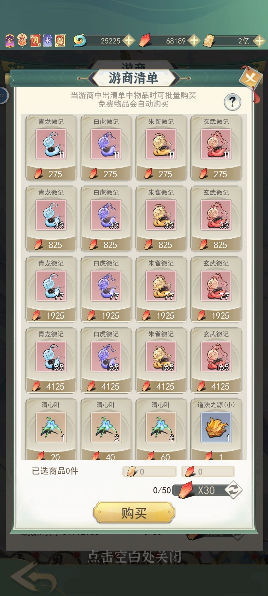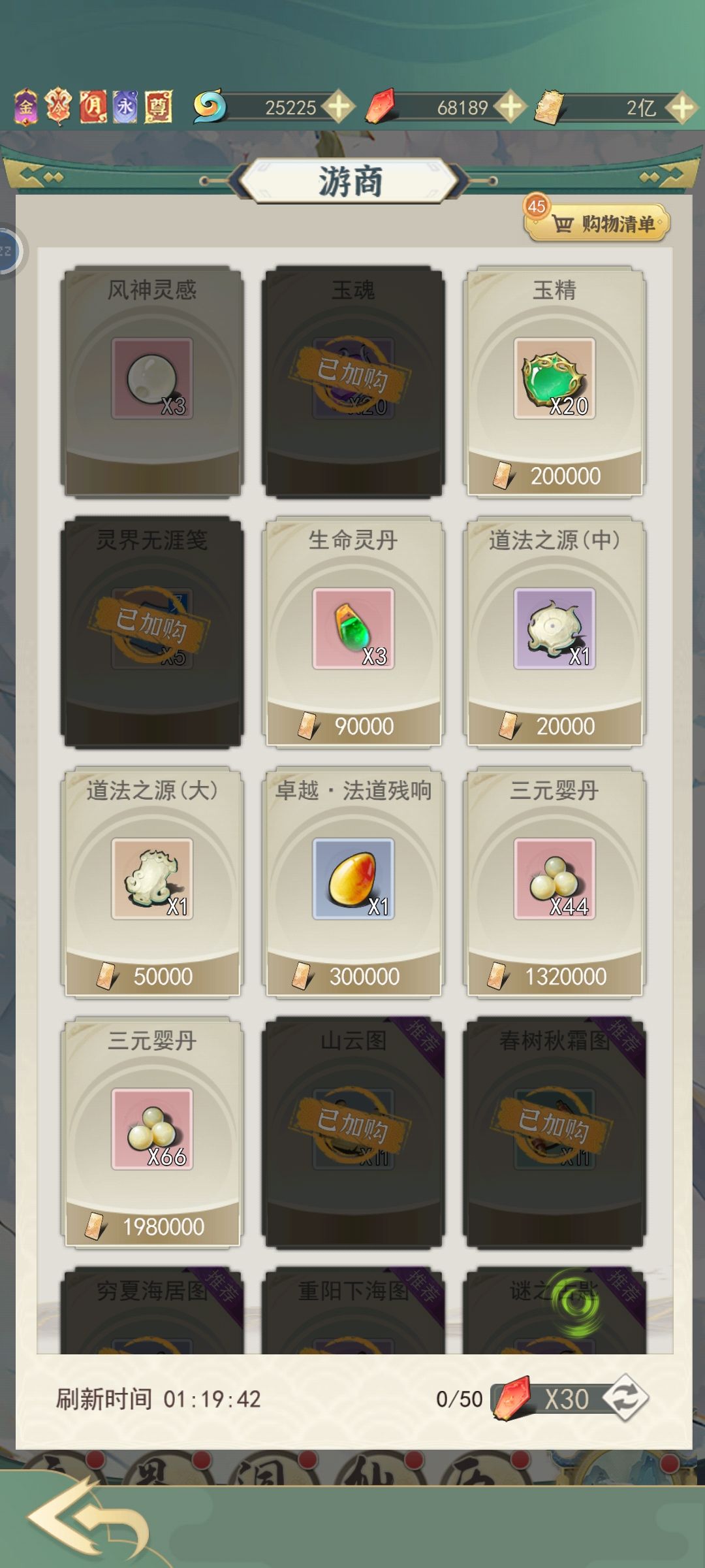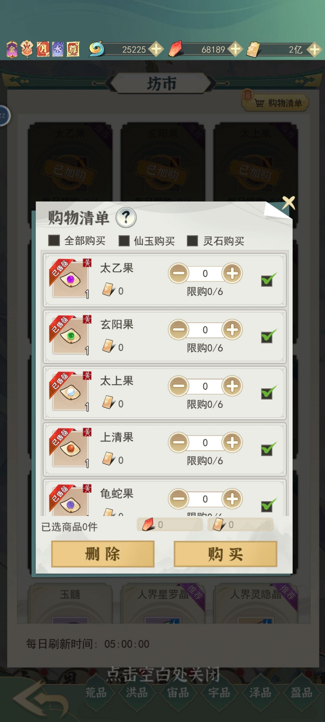 游商右上角购物清单,选择你要购买的商品加入购物车进行购买,此操作之后,游商刷新后会自动添加上次购物车里的商品,就不用一个一个慢慢买了,坊市同理。坊市的果子&钥匙(灵钥,七钥等)很重要优先购买;虚空石扩充背包,前期有就买,前期的背包格子不太够用;其他酌情购买(仙玉购买的少花,灵石的看需求,灵石在飞升仙界以后可以用来兑换书页。)