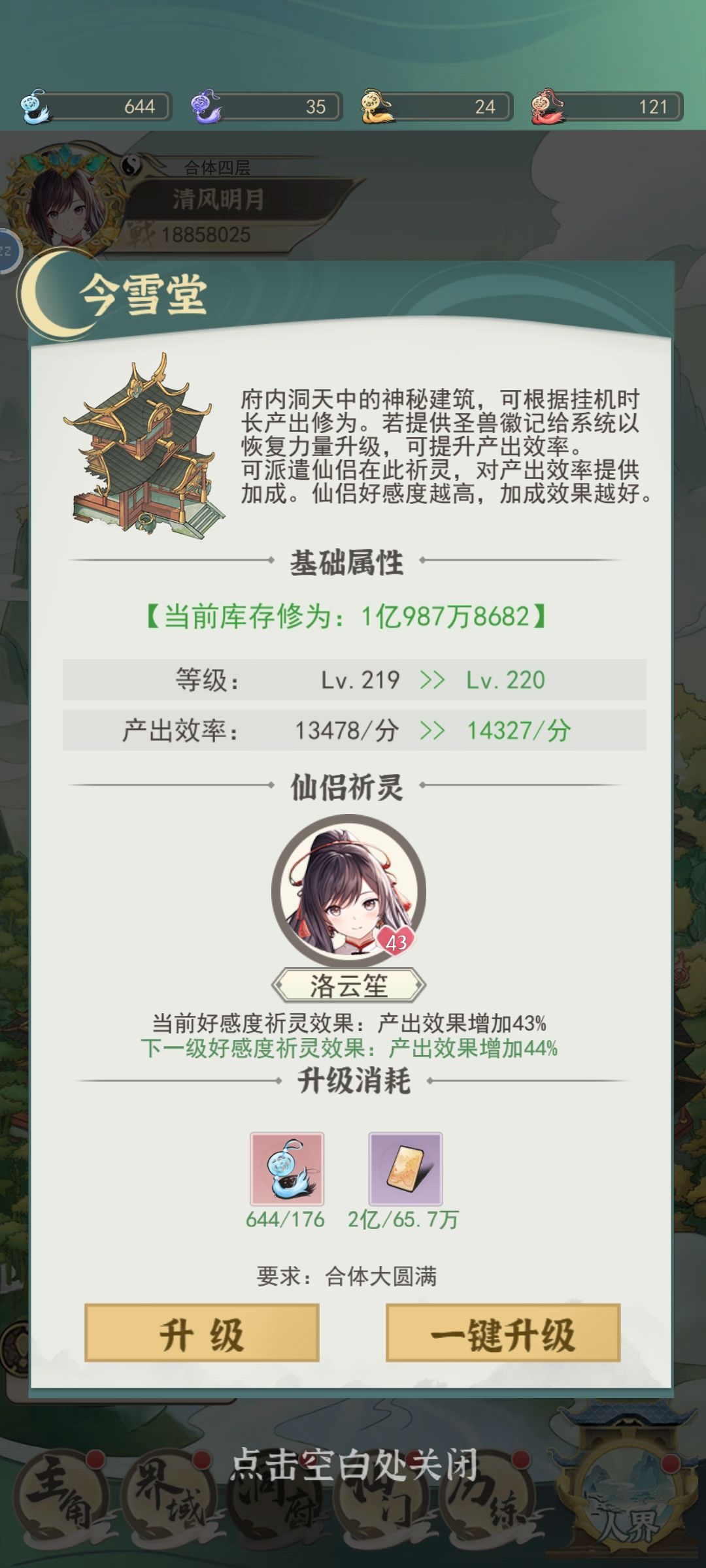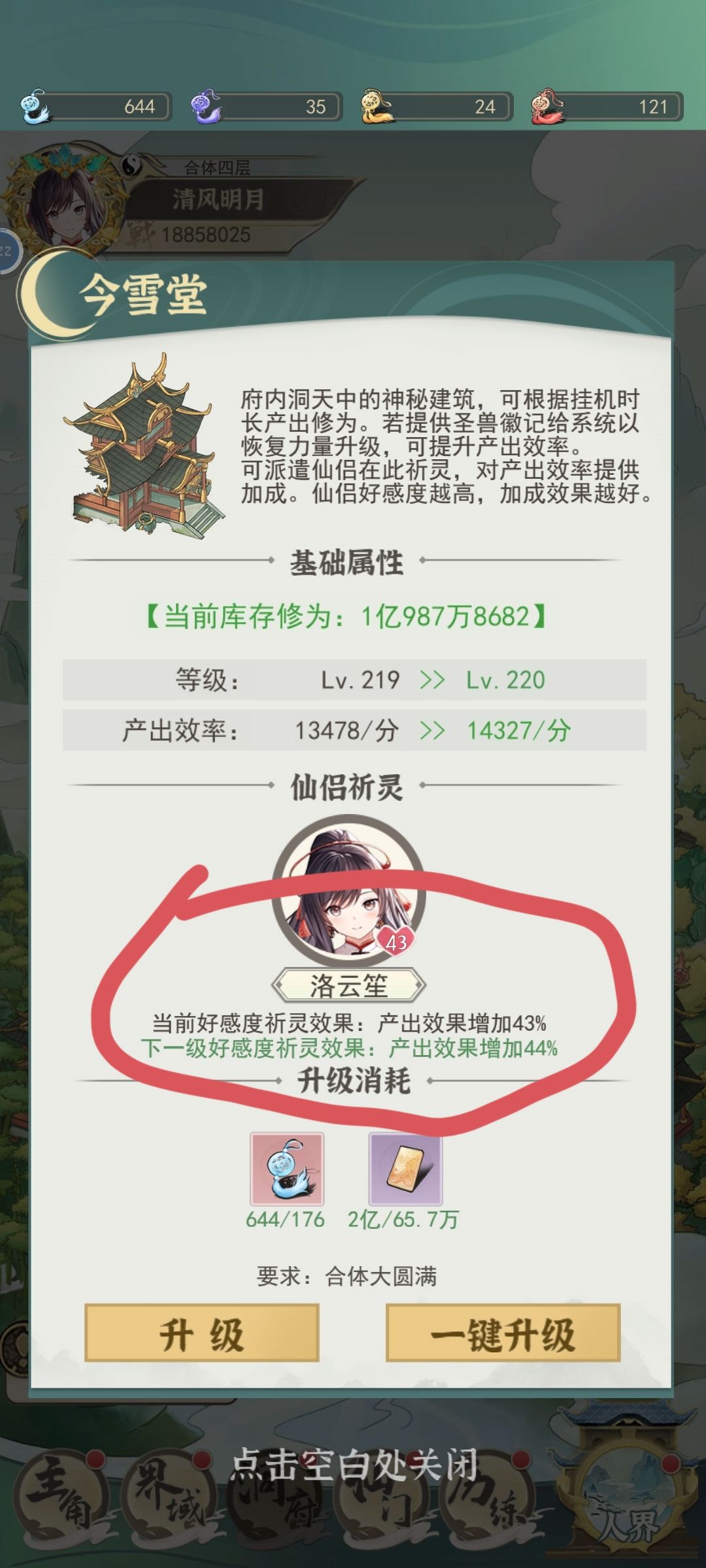 仙友等级43级之后所需礼物大量增长,可以先刷一个43级仙友挂在今雪堂。