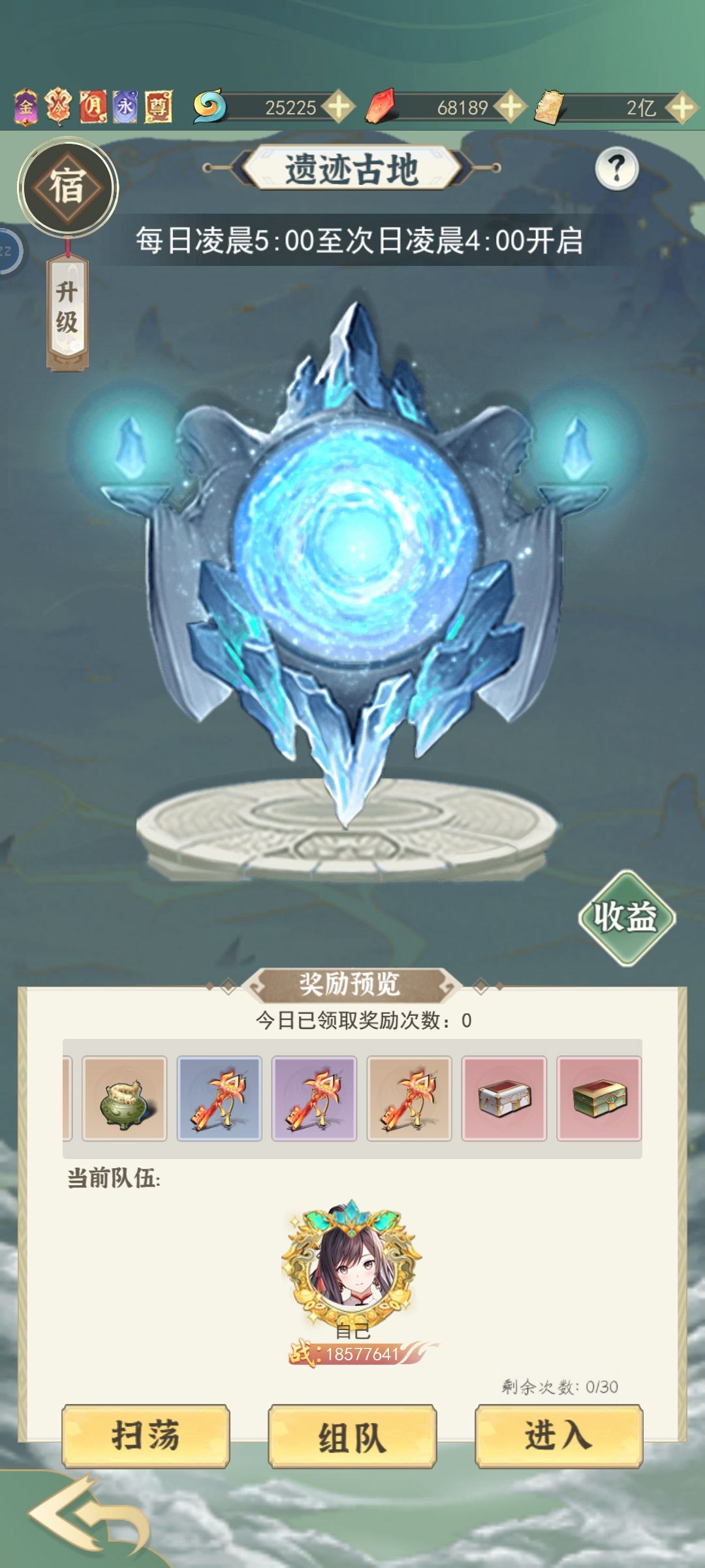 每天免费领取3次奖励,可以扫荡也可以手动。扫荡获取随机,手动很麻烦(进遗迹,挂机到最后一分钟打掉大boss退出即可,只有大boss会出法宝箱子。中途也可离场,但超过五分钟直接强制退出),每天有三十次进入遗迹的机会。手动党可以在打完三十个遗迹后选择三个最好的奖励。