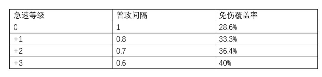 因为通过测试,sp伊卡洛维技能的持续时间是固定1.6秒,不随攻速变化,意味着随着攻速的增加,两次技能间隔缩短而时长不变。当sp伊卡洛维只有基础攻速时,免伤覆盖率只有1.6/(4+1.6)≈28.6%,如果能提升三级,就达到了1.6/(2.4+1.6)=40%,这是非常大的提升,具体如下表