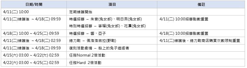 - 4/18(二)上午10點,朱音(兔女郎)、寧瑠(兔女郎)、花凛(兔女郎)、明日奈(兔女郎)特選招募期間內獲得的招募點數重置。