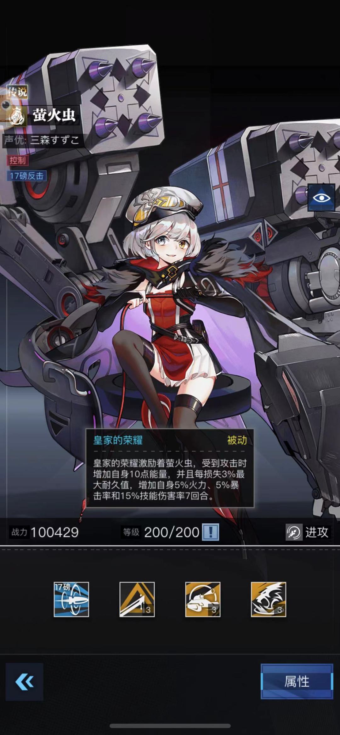 萤火虫(这里提一个大家都容易忽略的性价比超高战姬,就是她!小虫虫,真的不要小瞧她,可以从皇家碎片以及工会兑换或者各种卡池以及定向中产出。我强烈建议大家可以留着,世界boss的王者,伤害不输福克以及船长,但是野外拉胯。并且虽然前期拉胯,但是也可以用于组成极寒皇家的2+4队伍,这也是我推荐大家不拉水仙的原因。用虫虫替代,省下大笔资源)