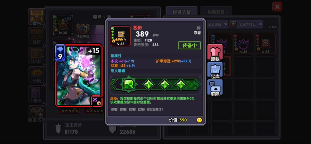 属性:木攻,护穿,爆伤,攻强,暴击(根据自己属性,5选3)