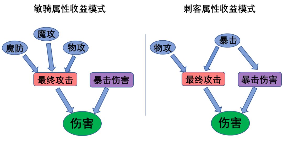 和敏骑有魔攻魔防收益类似,BBC也有着自己的额外重点属性,如下图所示。敏骑的机制大家应该多有了解,多重专属收益的属性成就了敏骑的强大,作用机制简单来说就是物攻、魔攻、魔防相互乘算(具体公式放在最后),导致普攻攻击力膨胀到一个可怕的数值。而BBC则是另一条道路,由一项暴击影响多项属性,提升平砍伤害,虽说比例跟敏骑比不了,不过刺客暴击属性被符文以及刺杀光环放大之后,也不差算是高收益属性了,可惜没有稳定的暴击存入,目前的暴击属性是有上限,不可持续成长。