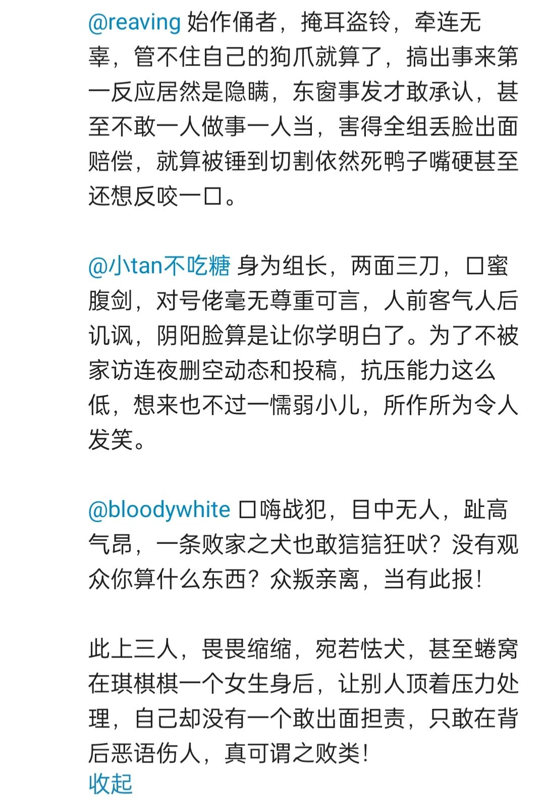 我来谈谈自己的看法,就是这个事情在发生之后,上图的这三个人几乎是完完全全避开了所有的正确做法。先是在游戏群里的聊天截图被人放出来,完全不尊重被毁号的当事人。其次是直播间里大放厥词,怼直播间观众不说,还单方面宣布已经和当事人达成和解。攻略组置顶的声明,也和这三个人没有什么关系,是署的棋棋的名字。一直到今天下午的时候,三人之中已经有人开始注销b站账号,QQ号搜不到,关闭b站空间等一系列操作。他们一边在声明里说号佬是攻略组的爹,另一边是群里的聊天的《圣经》,一边在直播间里说会完全赔偿当事人的,一边又在删号跑路。