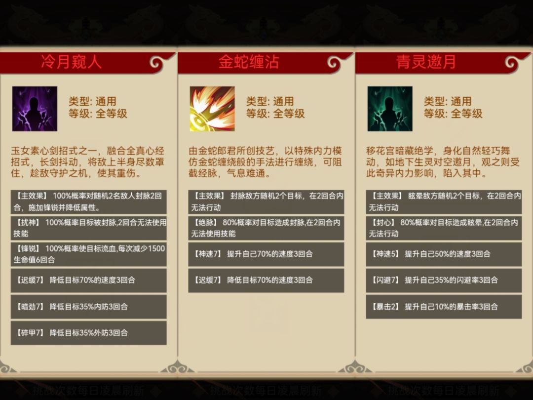 效果如图,非常优秀的控制技能,概率高、功效大,缺点就是获取难度,虽然不限使用等级,但白嫖需要很久(演武场积分、寻龙密卷兑换)。氪金选手早期就能拿到冷月窥人(还有个清饮小酌,都是势力3至尊令兑换)