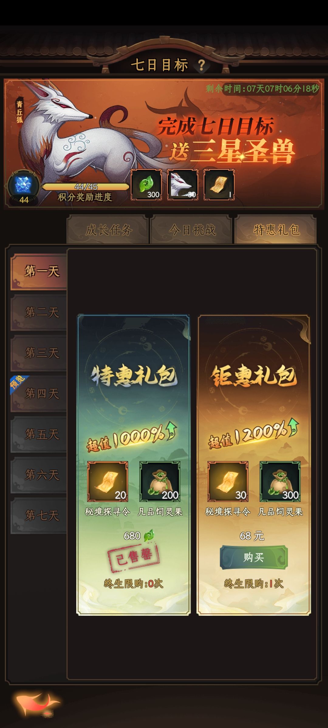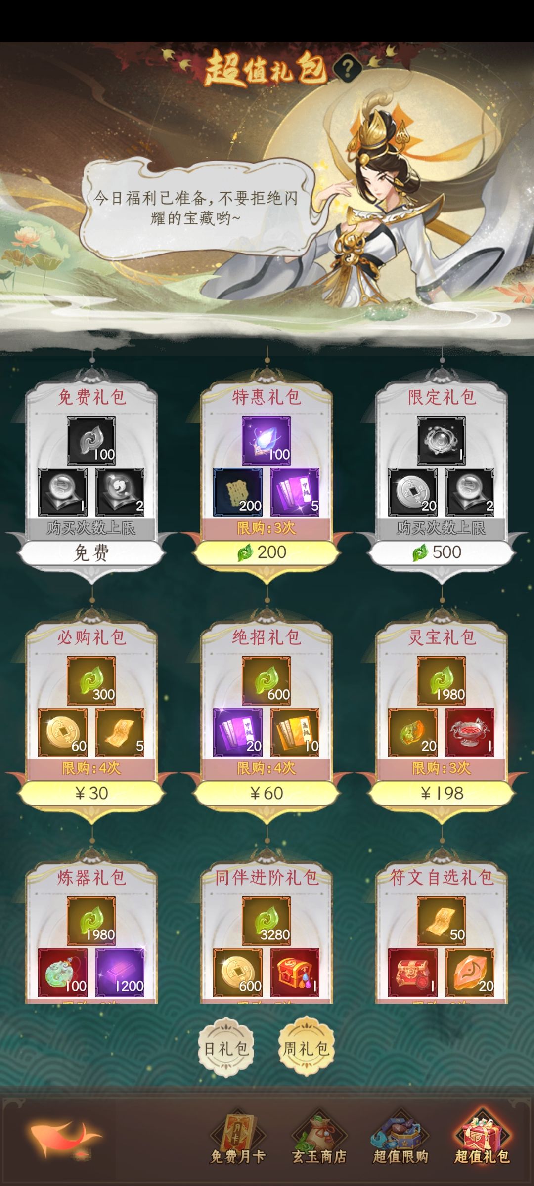 第一天还有个宠物榜 冲榜是有奖励的前10可以白嫖个朱厌 礼包里 200玉 买的卷 都买完