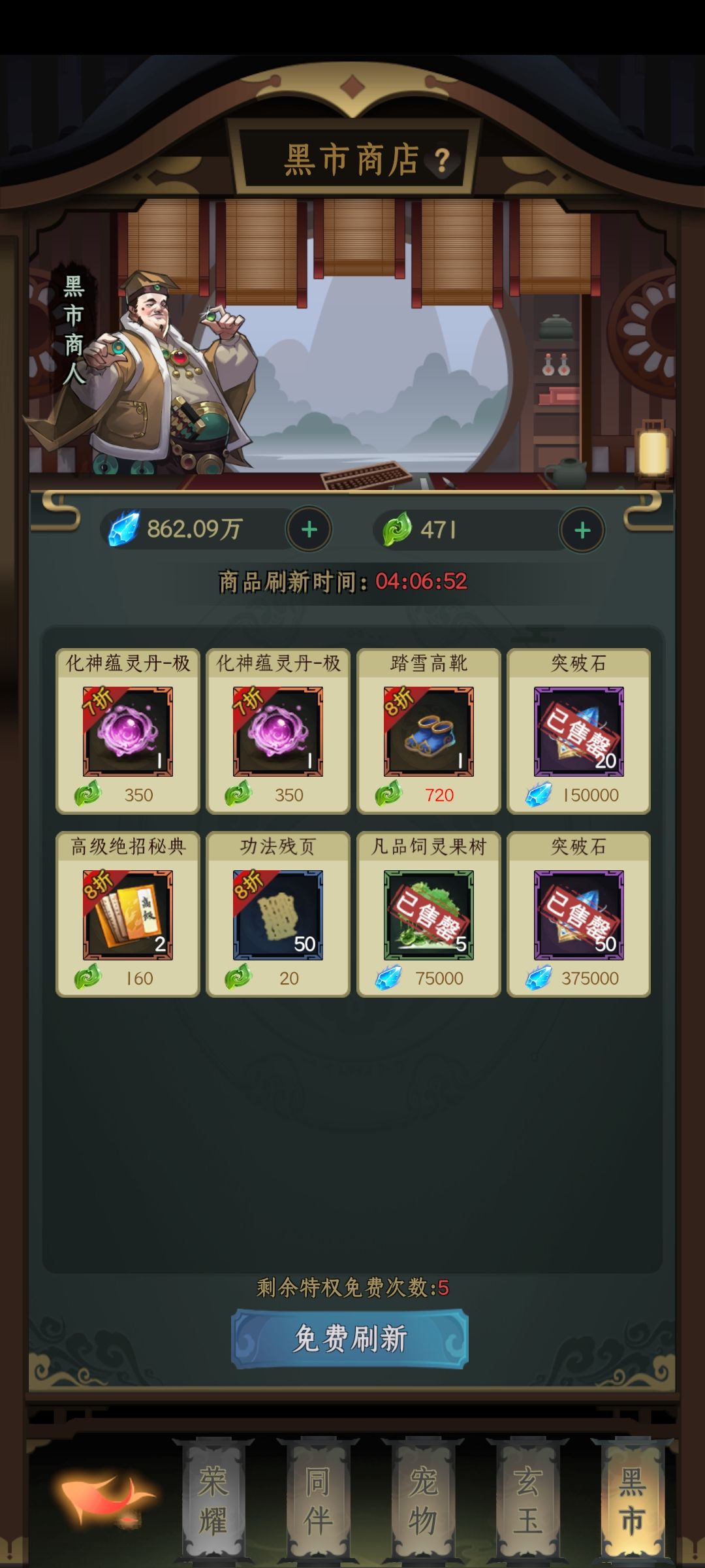 突破石 黑市刷新到 是灵石买的 看到了买一下 还有心法礼包 看到买 还有饲灵果树 刷到就买