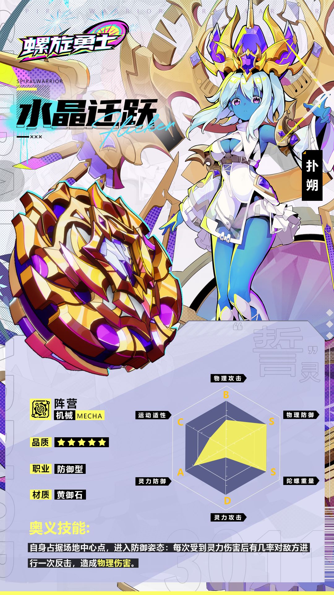 波比战力分析显示,以黄御石打造的“水晶迁跃”陀螺在物理防御表现S级,陀螺重量S级,扑朔在赛场中发动奥义技能时,会占据场地中心点并进入防御姿态,每次受到灵力伤害后就有几率产生反击效果,造成物理伤害。那么,就期待这位奇特的机械少女在本次本次试炼场的精彩战斗吧!