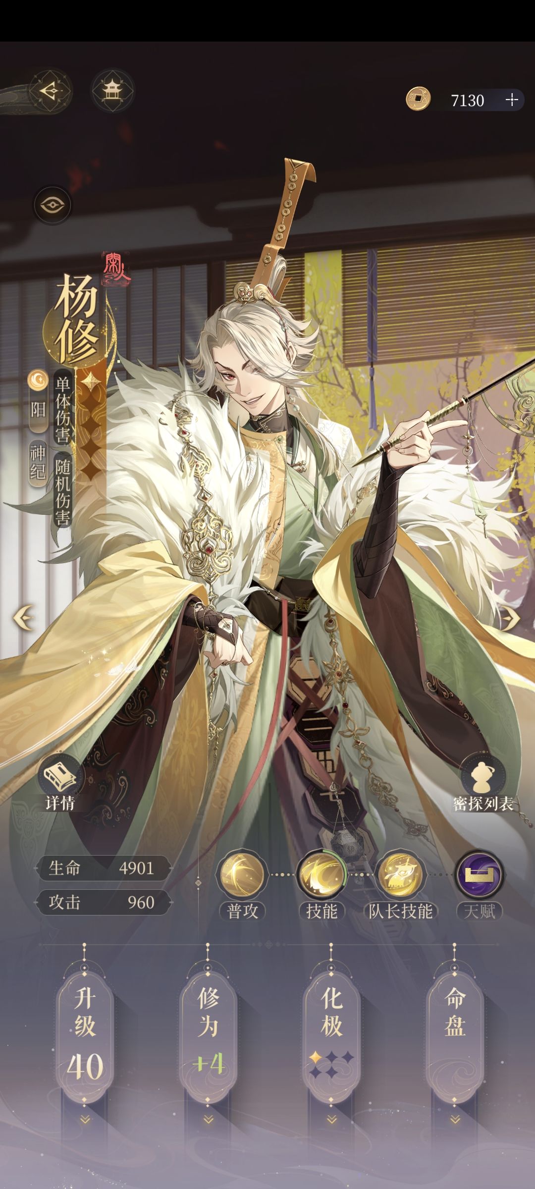 目前我的杨修培养程度如下,刚刚打高级历练,骰子摇到6 6,伤害直接飙到八千五,爽爆了好吗