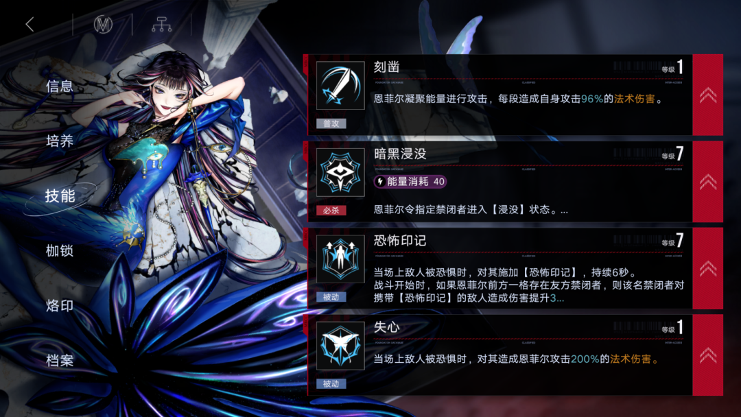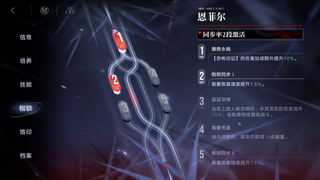 战斗开始时可以为站在恩菲尔正前方的一名友方提供60%(其中有1枷锁的10%提升)的伤害提升效果,这个增伤只会对被【恐惧】的敌人有效,每个被恐惧后的敌人都会有6秒的增伤时间(此增伤效果乘区属于“造成伤害提升”乘区)