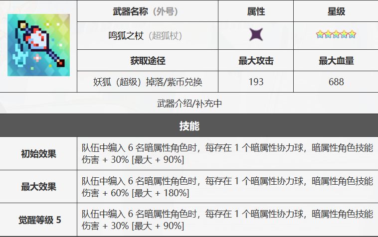 鸣狐杖可以说是本次共斗武器中最强大的武器了,作为暗面包体系的武器在三个面包的情况下可以作到全队270%的技伤加成,是暗面包的核心武器,如果已经能组出暗面包的玩家推荐优先换取