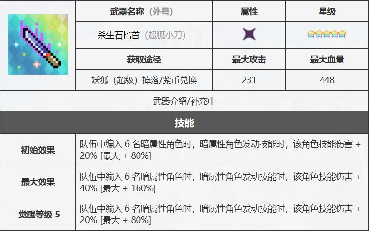 杀生石匕首则是暗技伤通用的武器,暖机后数值同样很高,如果没有暗面包的玩家们可以优先换取这个武器