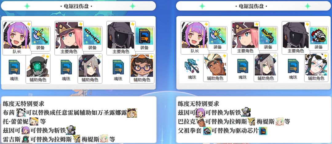 电锯妹的技伤盘则是主打一个包罗万象,sub位的选择非常多,当你有斩铁时也可以斩铁当队长sub电锯妹,也有拉fever条的能力