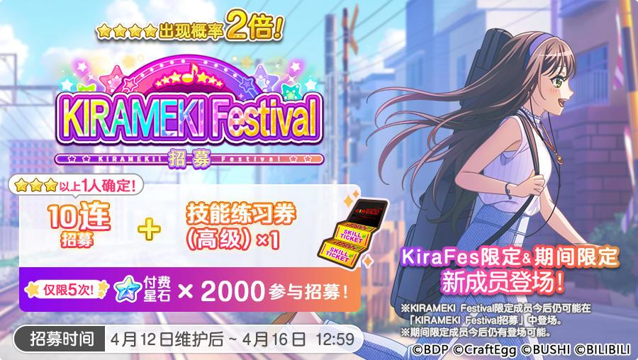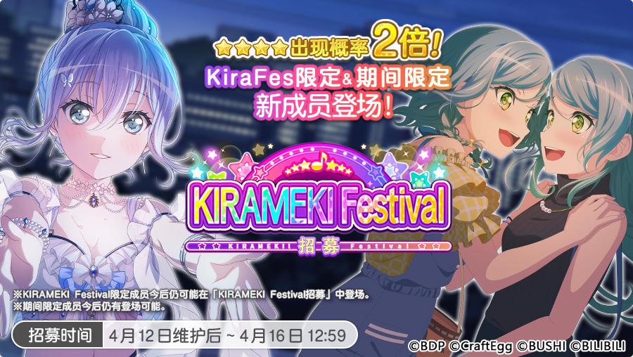 PS:4月16日「KIRAMEKI Festival 招募」结束后,游戏内将开启「波光粼粼 幻想的水精灵招募」,期间限定成员将在此招募中登场,KIRAMEKI Festival限定成员不会在以上招募登场。