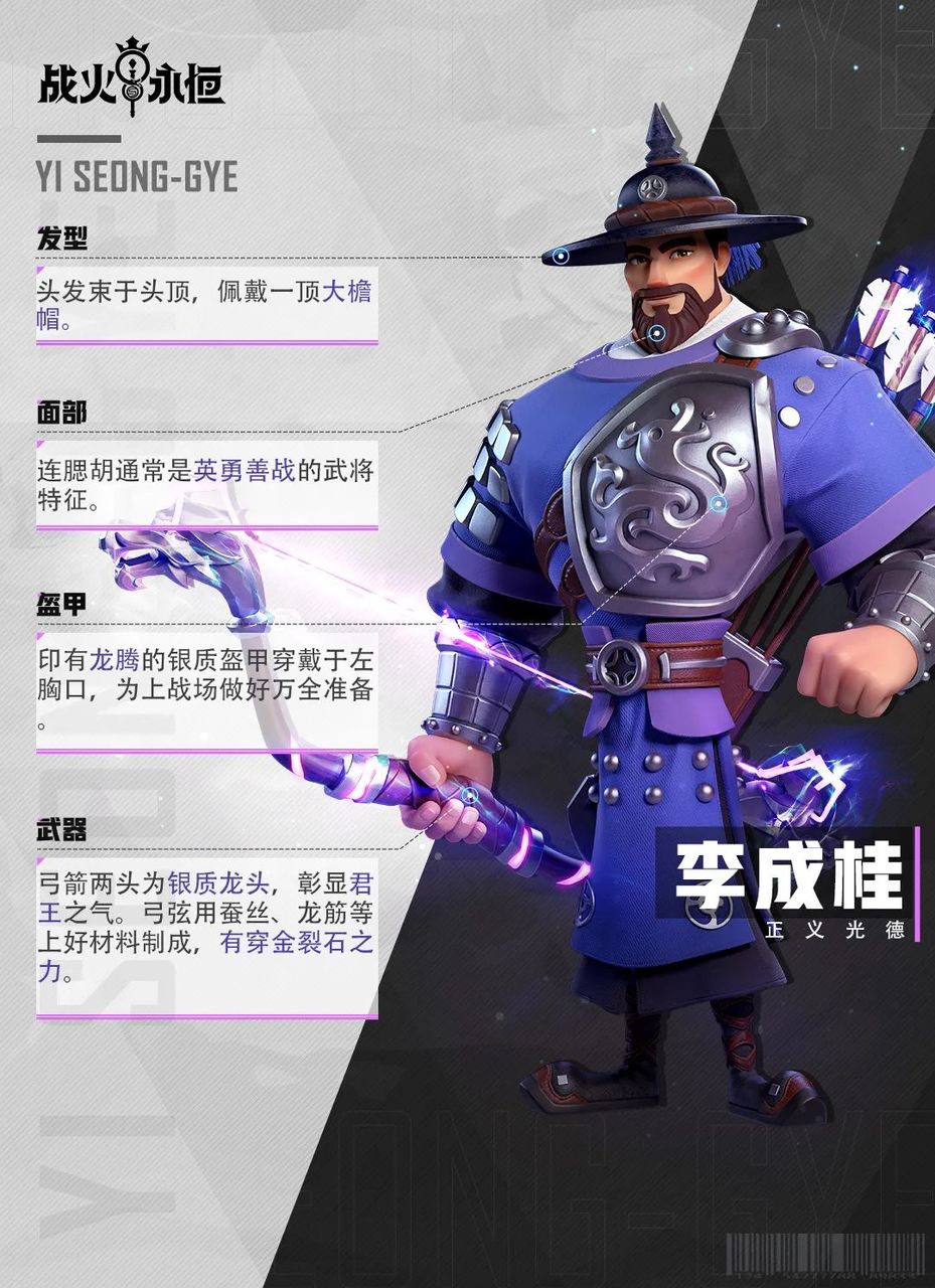 李成桂不仅是朝鲜王朝的开国之君,更是一名箭术如神的战士。角色设计师在塑造李成桂帝王形象的同时,也努力描绘着他精湛的箭术。据记载,李成桂自幼喜好打猎,弓马娴熟,在战场上横扫千军。在诺伦大陆里,李成桂手持龙头弓箭,霸气外露。一起来看看美术设计思路图,了解更多角色设计细节吧!