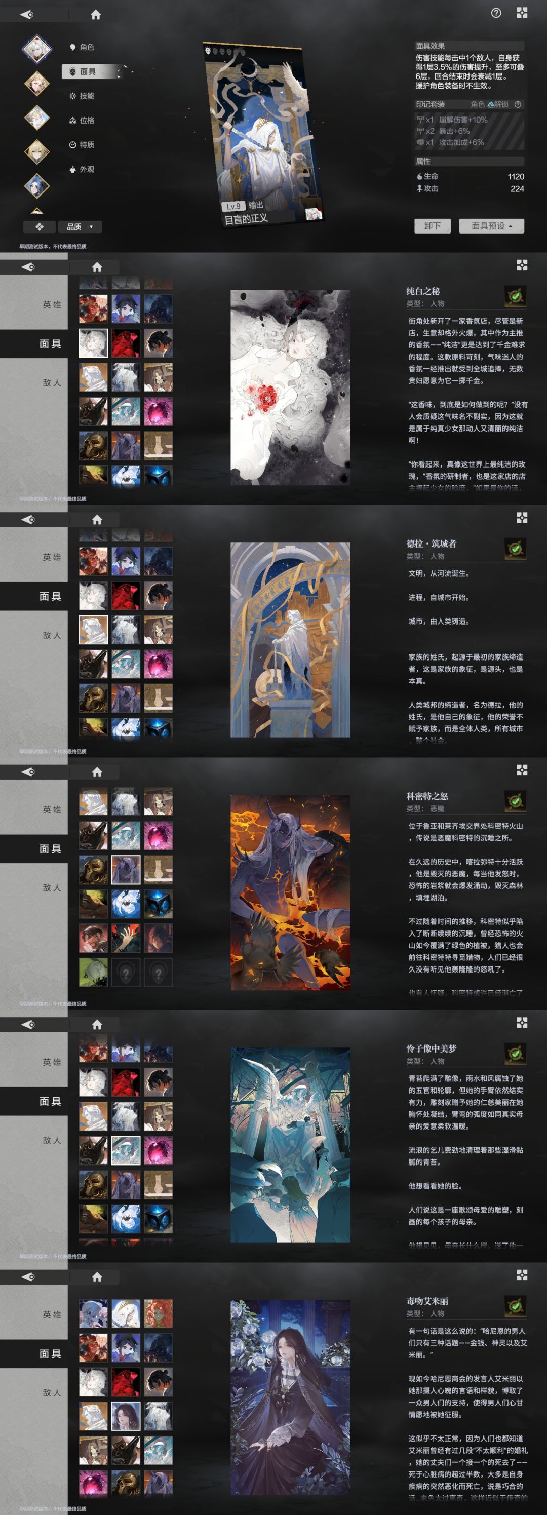 其次,面具,通俗来讲就是专武嘛,但是从界面可以看出来,哎他不说是谁的,所以就得看小作文,然后自己配,我是那种介绍一长我就看不下去的玩家,所以配面具就时常觉得迷茫,希望能改进这一点吧